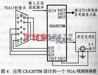 图4是应用CXA2075M设计的一个VGA/视频转换器,图中,左边的VGA15针接头可接在电脑主机显卡的VGA接口上,输出部分可以通过视频端口或S端子与电视机相连接,同时本转换器还可和电脑显示器进行接口以实现同步显示。